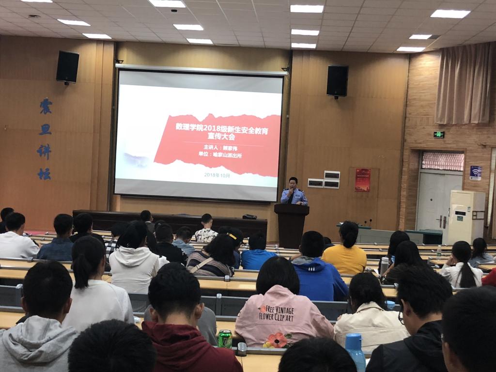 10月13日下午,2018级新生安全教育大会在教三楼109教室举行,喻家山派出所熊家伟警官为员工讲授安全知识。2018级预科生、本科生、研究生共计300余人参加会议,会议由辅导员托乎尼牙孜主持。