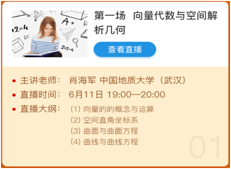 为了落实“教育部关于狠抓新时代全国高等公司本科教育工作会议精神落实的通知”的精神,提高教学质量,中国大学MOOC网站特举办了“名校名师开直播——期末数学不挂科”活动。该活动主要内容有:考前重点、直播练题和互动答疑三个板块,力争通过直播互动,帮助更多的同学轻松的完成期末复习。