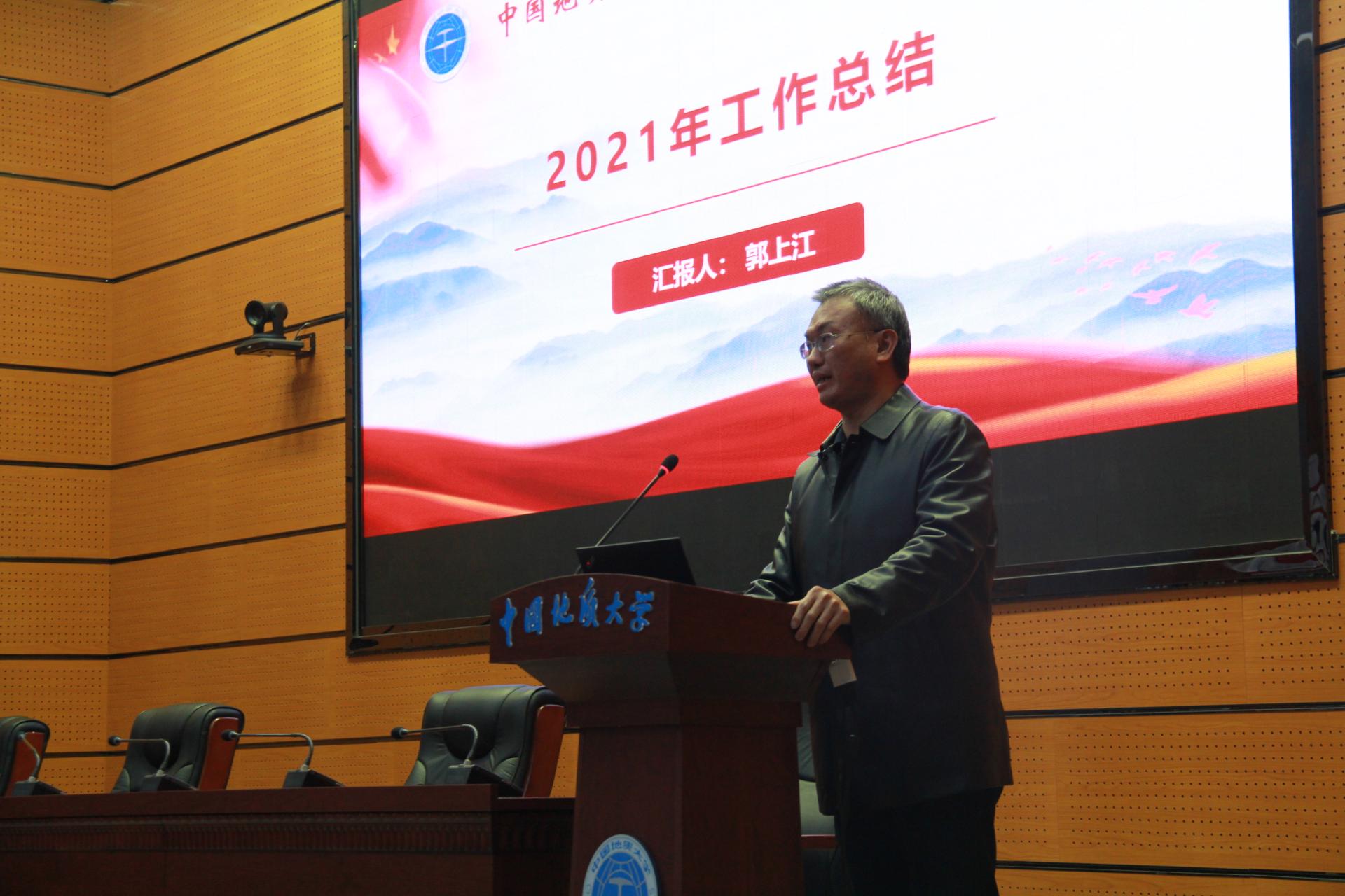 经理郭上江代表公司领导班子作了2021年工作报告。他在报告中全面总结了公司一年来的各项工作,重点介绍了在党建与思想政治工作、学科与人才队伍建设、本科教学工作、科研工作与国际交流、学位与研究生教育工作、实践教学与安全工作、员工工作、少数民族预科生教育管理工作等方面取得的突出成绩,2021年公司取得了以科研成果亮点突显、研究生教育步入新阶段等为代表的10项标志性成绩。同时分析了公司存在的问题及原因,对2022年工作进行了展望,着重强调了科技奖项申报、省部级平台申报等工作,争取为下一轮博士点申报工作奠定基础。
